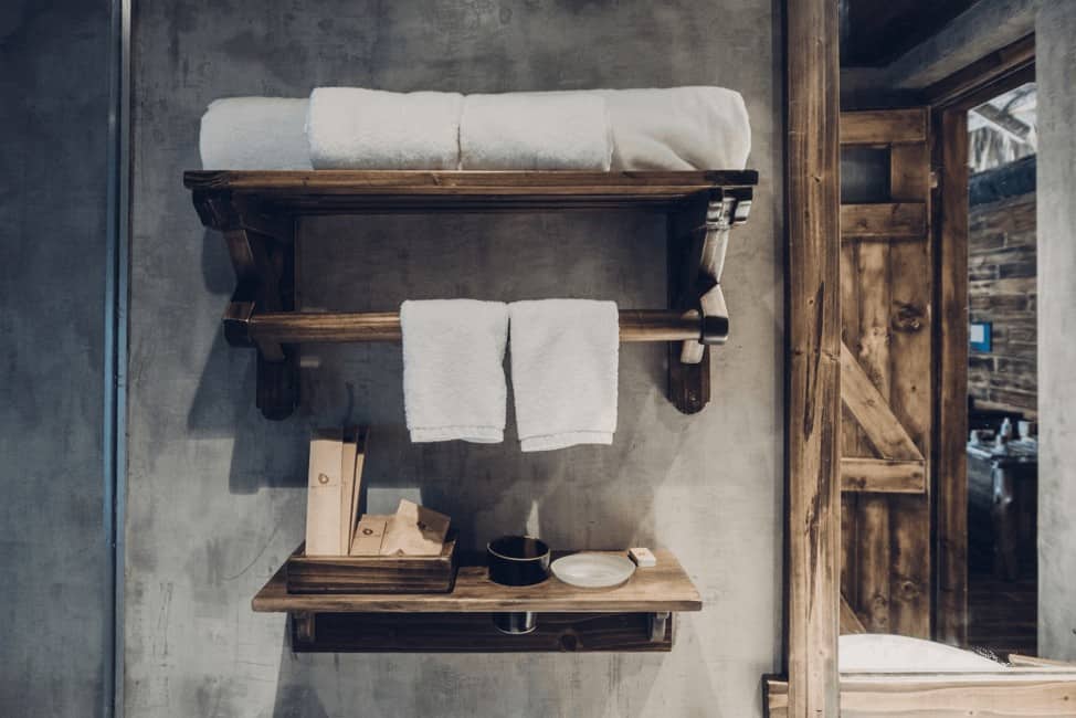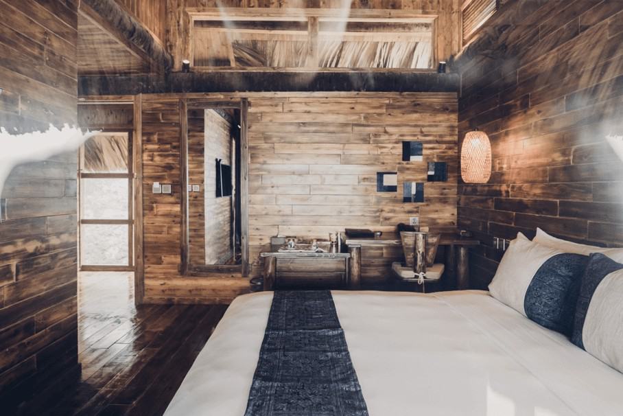 Một căn bungalow thật xinh xắn với những điểm nhấn hài hoà, màu sắc nhẹ nhàng mộc mạc tạo cảm giác dễ chịu khi bước vào. Tôi cứ thi thoảng lại reo lên khe khẽ khi nhìn thấy những chi tiết của văn hoá dân tộc được đan cài thật khéo léo chứ không bừa bãi và thừa mứa. Một bức tranh màu chàm của người H’mông trên tường gỗ, một tấm khăn thổ cẩm vắt ngang giường, hay chiếc bồn gỗ pơ mu của người Dao đỏ trong phòng tắm – đủ để khiến ta cảm nhận được màu sắc văn hoá của vùng đất này.