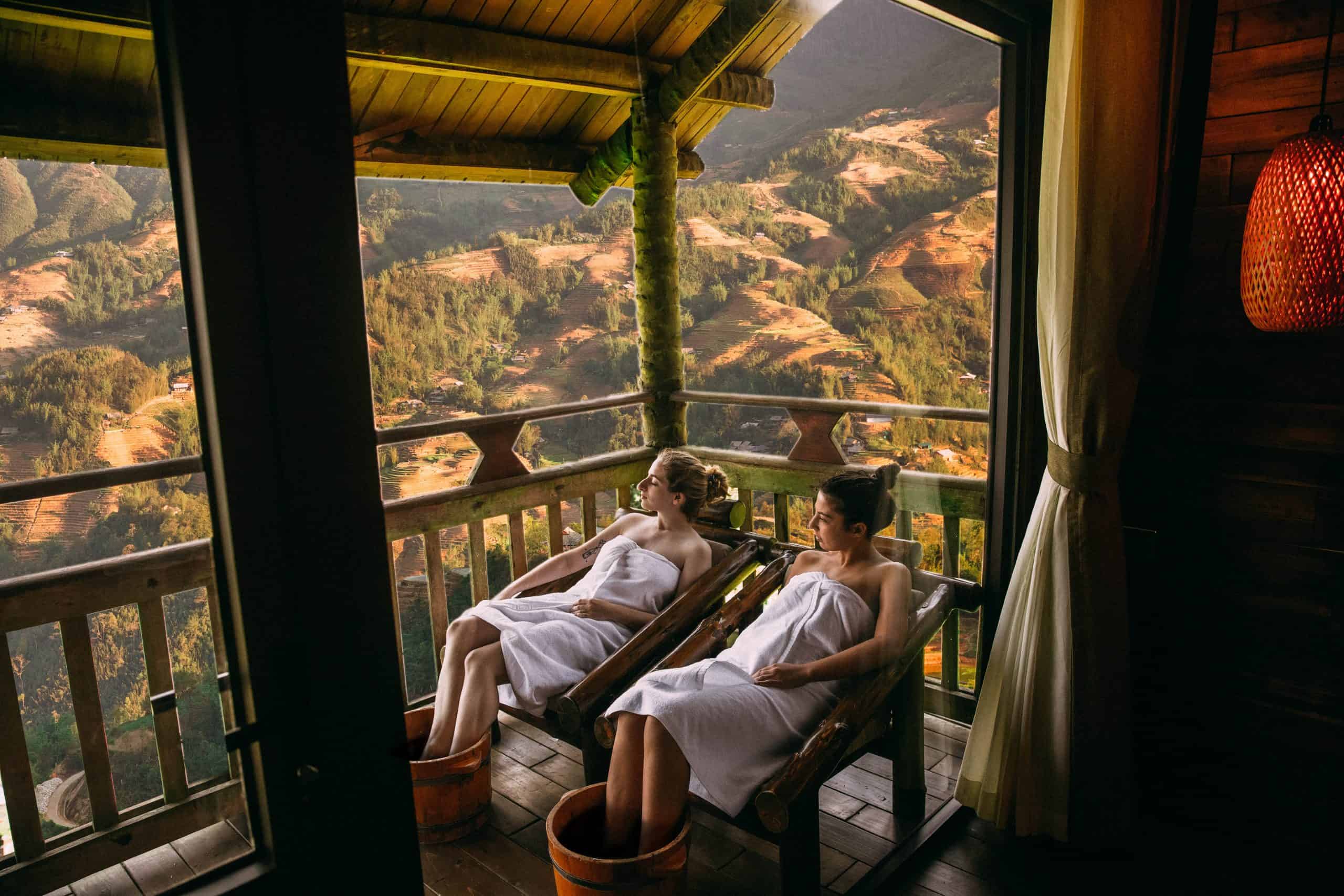 Sau một ngày khám phá thiên nhiên, bản làng, chiều đến du khách sẽ đắm chìm trong cảm giác thư thái đến từng hơi thở với dịch vụ spa & trị liệu bản địa như tắm lá thuốc cổ truyền người Dao đỏ, massage bấm huyệt, thải độc…hay thả mình vào bể bơi nước nóng với tầm view vô cực xuống thung lũng.