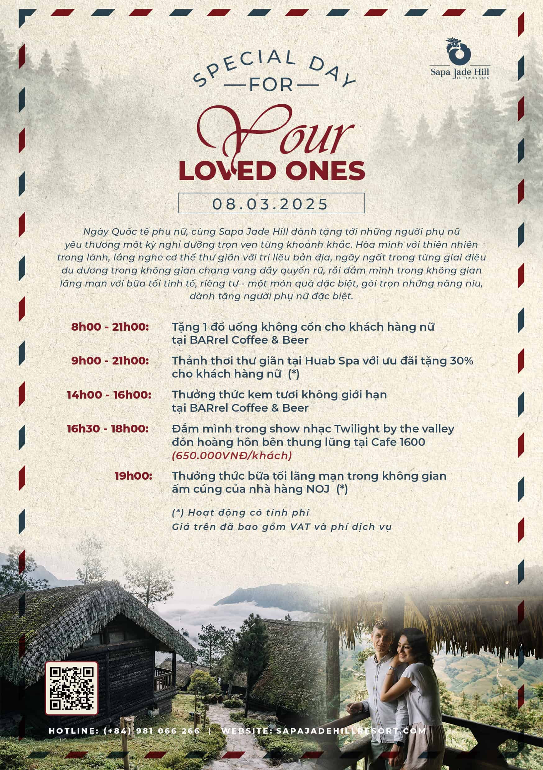 Ngày Quốc tế phụ nữ, cùng Sapa Jade Hill dành tặng tới những người phụ nữ yêu thương một kỳ nghỉ dưỡng trọn vẹn từng khoảnh khắc. Hòa mình với thiên nhiên trong lành, lắng nghe cơ thể thư giãn với trị liệu bản địa, ngây ngất trong từng giai điệu du dương trong không gian chạng vạng đầy quyến rũ, rồi đắm mình trong không gian lãng mạn với bữa tối tinh tế, riêng tư – một món quà đặc biệt, gói trọn những nâng niu, dành tặng người phụ nữ đặc biệt.